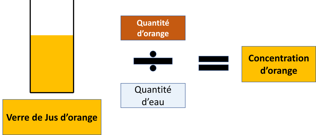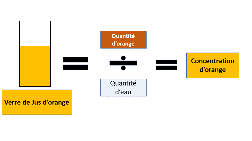 Un jus d’orange, c’est une part d’orange (pulpe d’orange) et une part d’eau. Le jus d’orange possède une concentration.