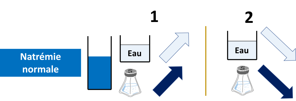 Les situations où la natrémie est basse sont toutes les situations où la quantité d’eau est supérieure à la quantité de sel. C’est « dilué ».