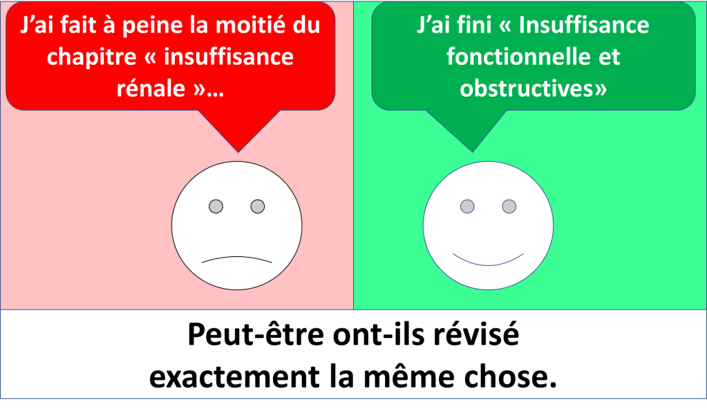 Se prévoir de réviser « toute une matière » (Genre « Aujourd’hui je fais la neurologie ») en une après-midi se soldera le plus souvent par une fatigue et également par le sentiment de ne pas avoir réussi parce que l’objectif était trop volumineux.