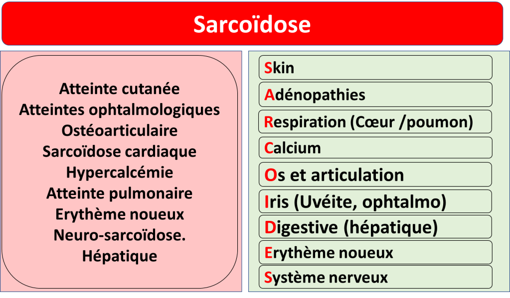 - Permet de retenir des choses sans logique (que la personne qui peut expliquer la logique de pourquoi la sarcoïdose touche ces organes là et pas les autres m’envoie un mail !) comme c’est le cas dans plein de maladies notamment systémiques.